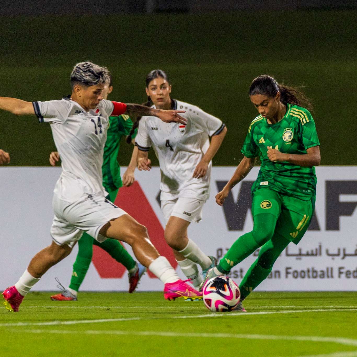 وفي الدقيقة 55، قرر مدرب صاحب الأرض إخراج لاعبة الوسط فاطمة منصور ولاعبة الجناح الأيسر صفا زدادكة، وإدخال كل من بسمة الشنيفي والجناح فدوى خالد، ليبدأ المنتخب السعودي في استعادة السيطرة على وسط الملعب، والوصول لمرمى العراق في أكثر من فرصة.