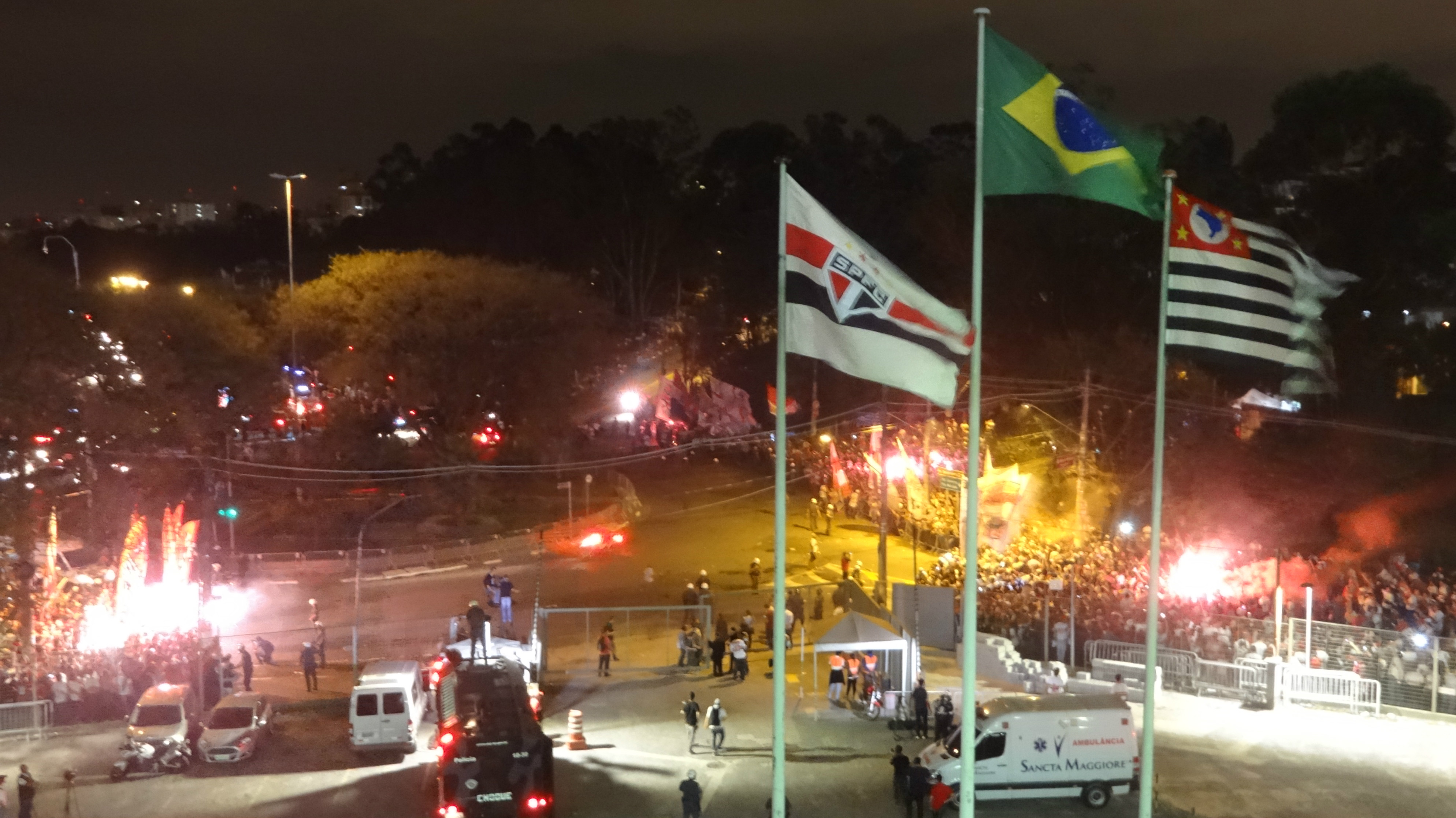 Pouco depois das 20h, o ônibus com a delegação são-paulina foi recebido com fogos, rojões, sinalizadores e muitos gritos de incentivo. Como já havia acontecido contra o Atlético-MG, o veículo parou do lado externo para sentir o calor da torcida.