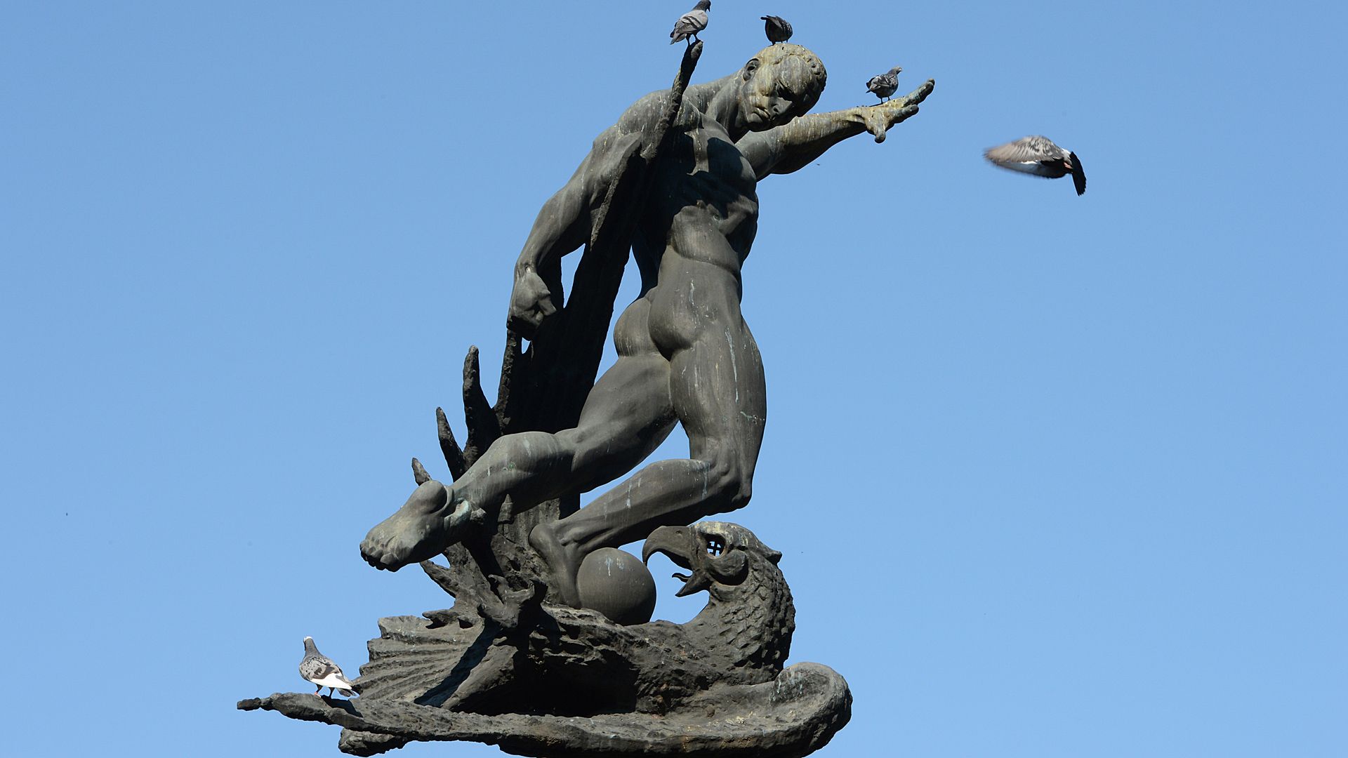 Der Sockel, auf dem der muskulöse, unbekleidete Mann steht, mutet an wie jene Säulen, die bei zahlreichen antiken Bauwerken der Römer oder Griechen als tragendes Element dienen. Ein Adler grätscht in die gestählten Beine des Protagonisten, der Schnabel ist geöffnet, die Flügel sind gespreizt. Im Auge des Greifvogels wurde ein Hakenkreuz eingearbeitet, das dem Tier einen morbiden Touch verleiht. Die bewusst martialisch gehaltene Skulptur vermittelt eine Überlegenheit des Mannes, zu dessen Füßen sich nicht nur der leidende, nationalsozialistische Adler, sondern auch ein Ball findet.