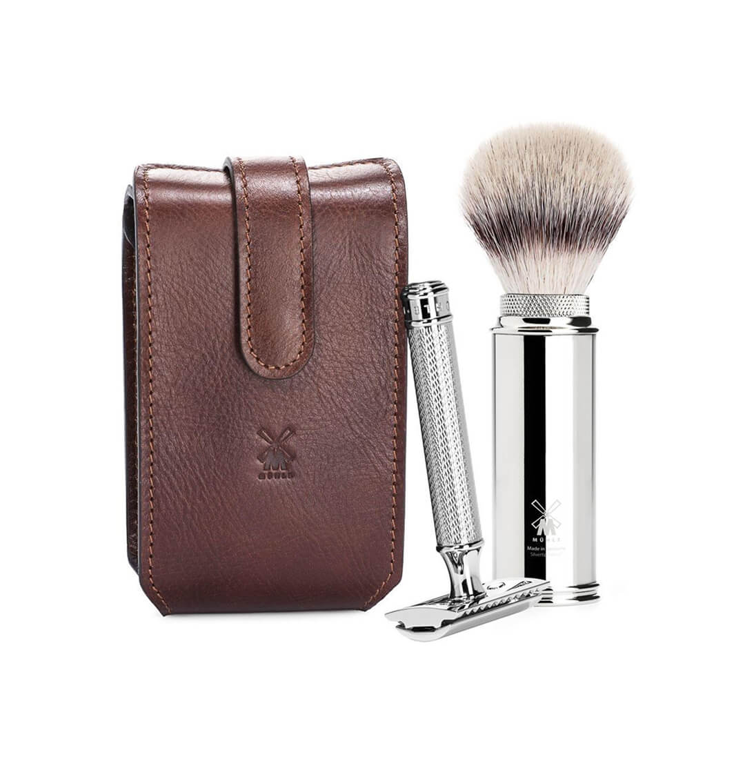 Travel light, shave sharp. The MÜHLE Brown Leather Travel Set pairs a Silvertip Fiber brush with a safety razor, all tucked into a leather case that only gets better with time. Effortless grooming, wherever you land.
