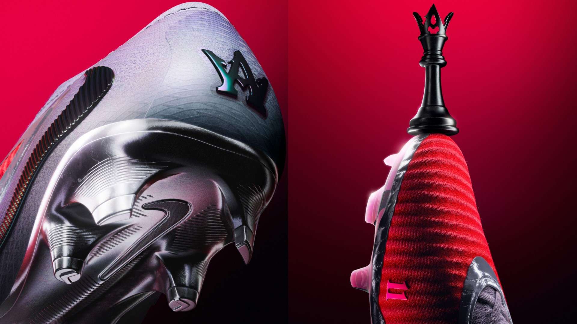 Il logo personale di Putellas appare sulla scarpa metallizzata rosso-nera brillante. Combina la "A" del suo nome con l'11, che appare due volte, in una corona, un riferimento all'eleganza regale della "Reina" sul campo da gioco.