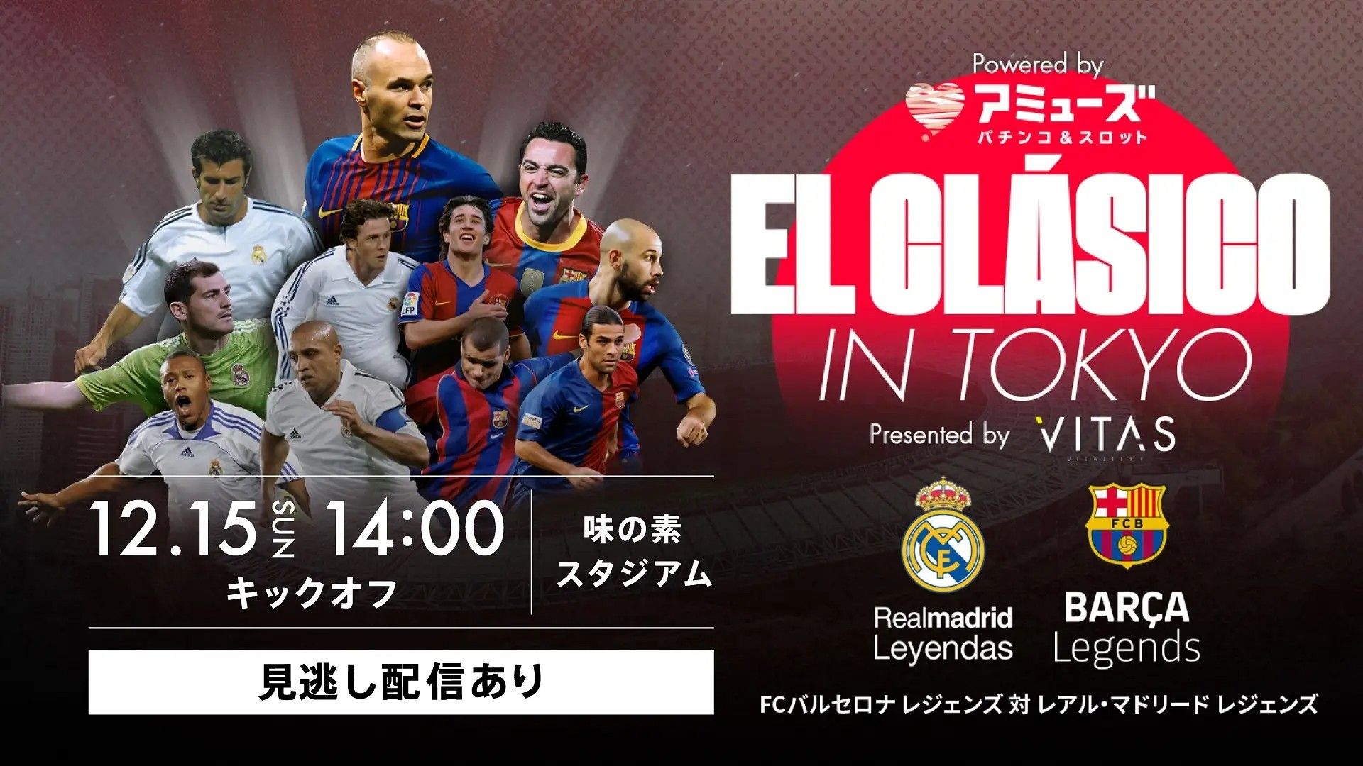 アンドレス・イニエスタの引退試合として、「アミューズ EL CLÁSICO in TOKYO Presented by VITAS(エル・クラシコ東京)」でFCバルセロナ レジェンドとレアルマドリード レジェンドが対戦する。