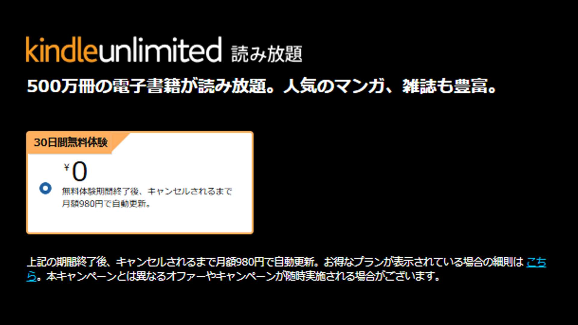 | Kindle Unlimited | 980円 | 30日間 | 500万冊以上 | 小説・ビジネス書・洋書に強い読み放題 |