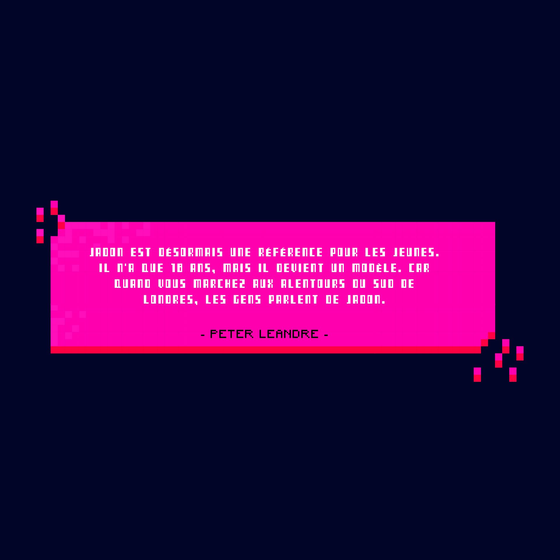"Les enfants suivaient Jadon partout; il était vraiment le chef de file, se souvient Norman Dawkins, l'homme qui a vu pour la première fois cet effronté de six ans sur les terrains en béton du sud de Londres. "Il y avait toujours un groupe d’enfants qui le suivaient partout. Il sortait faire un jogging, eux couraient après lui! "