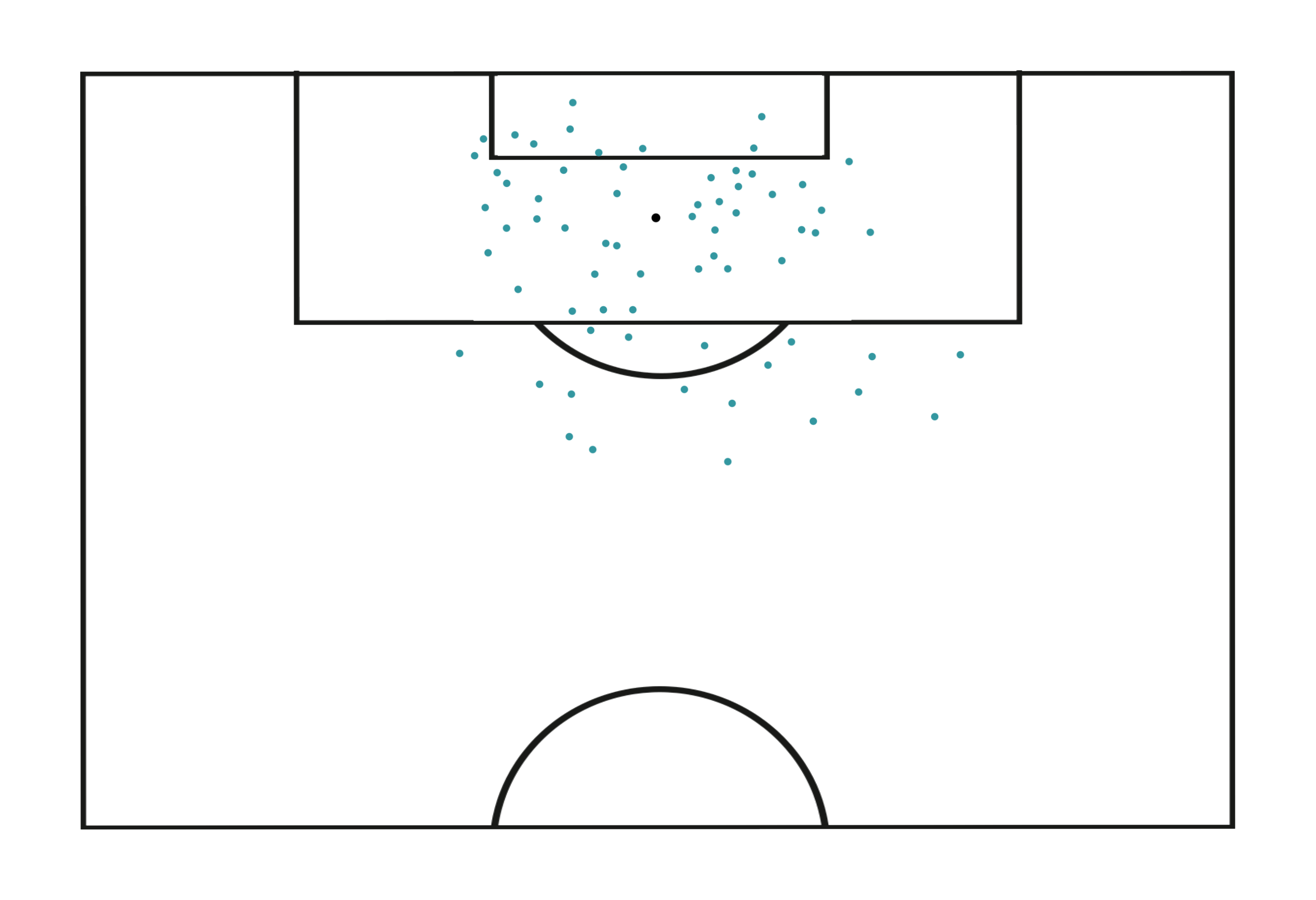 Ya completo el cuadro con los goles en su club, se ve una mejora sustancial en tiros de media y larga distancia, pero también se marca un patrón: Messi tiene una zona especial desde donde suele marcar.